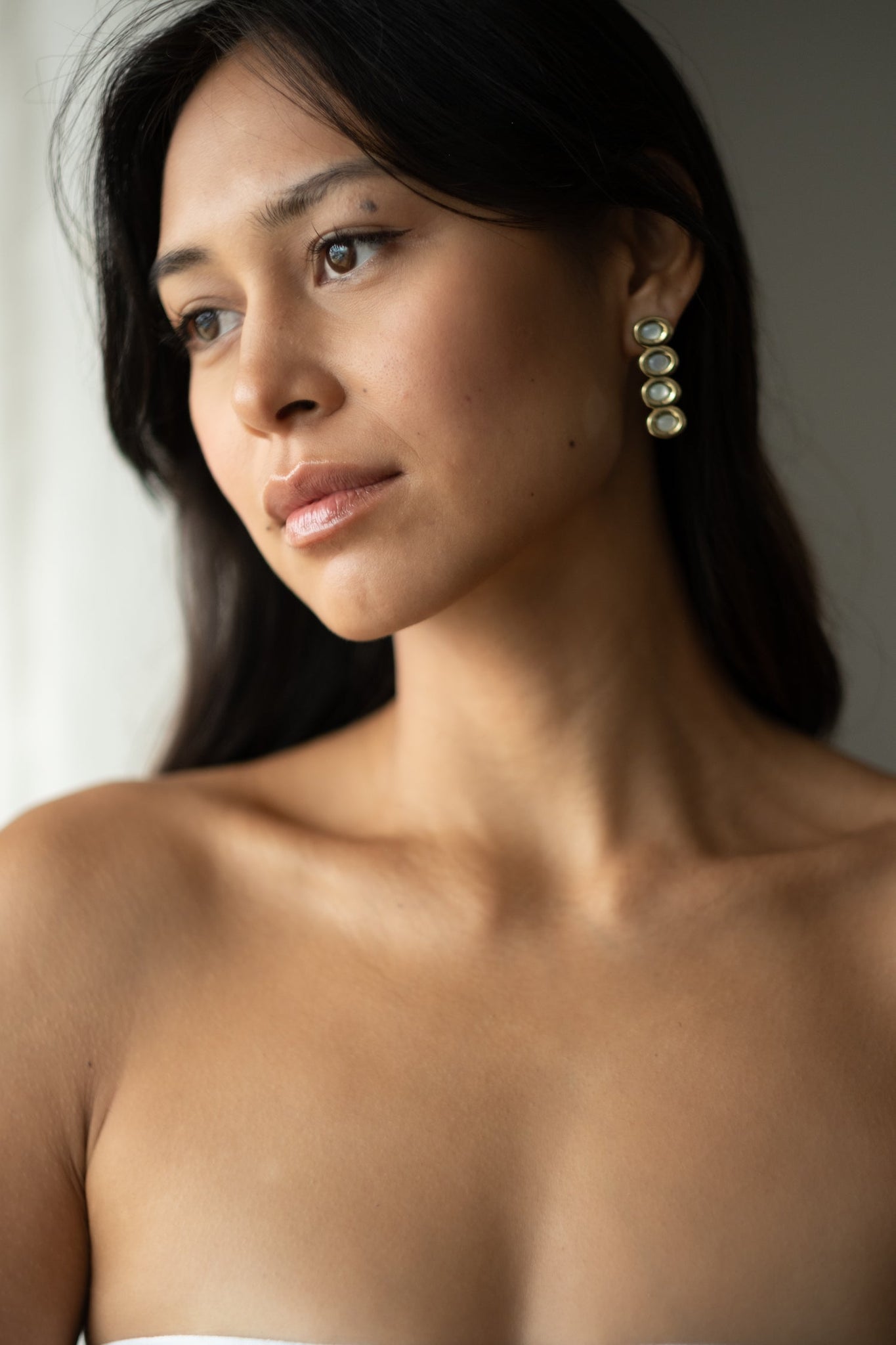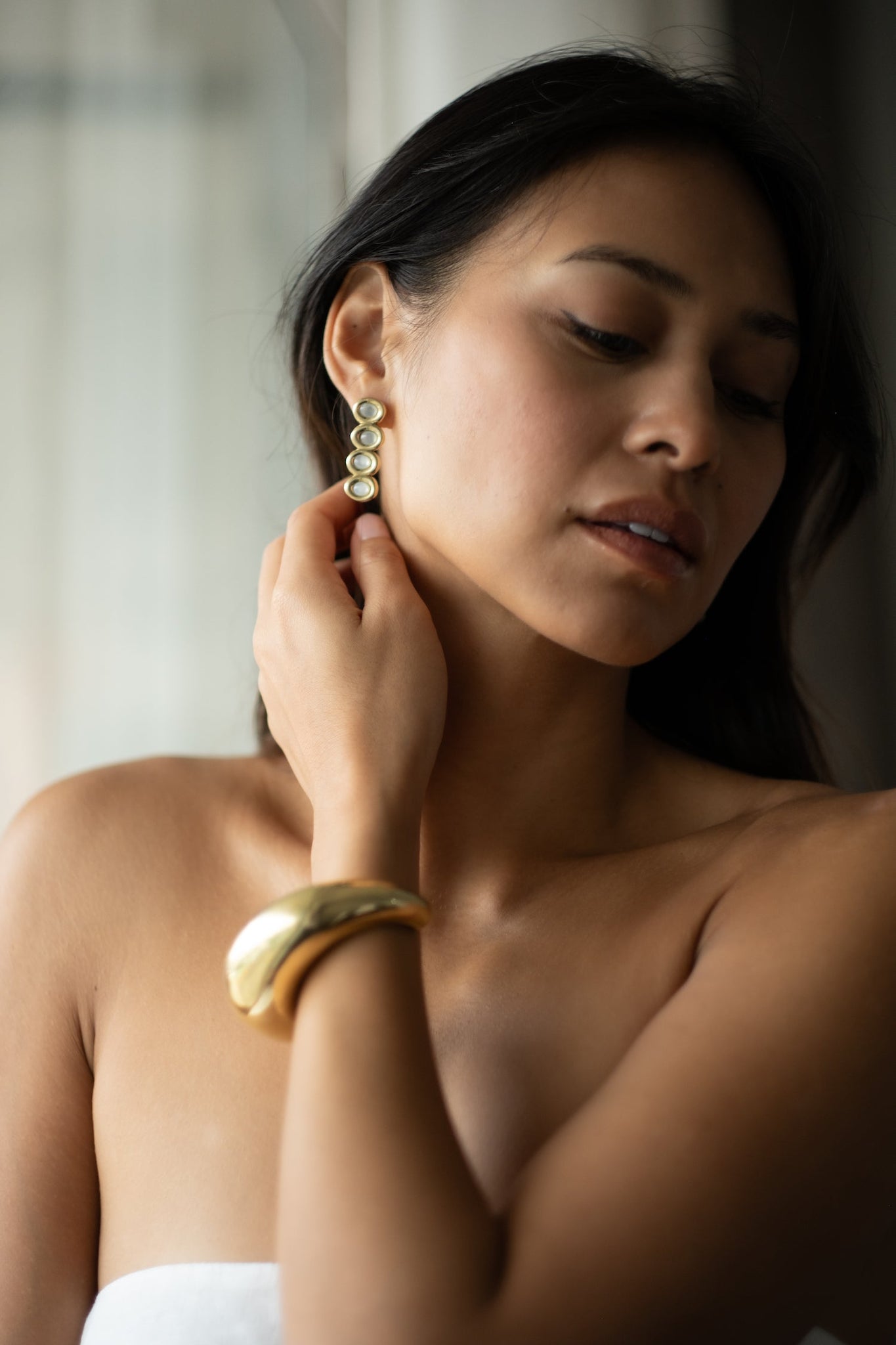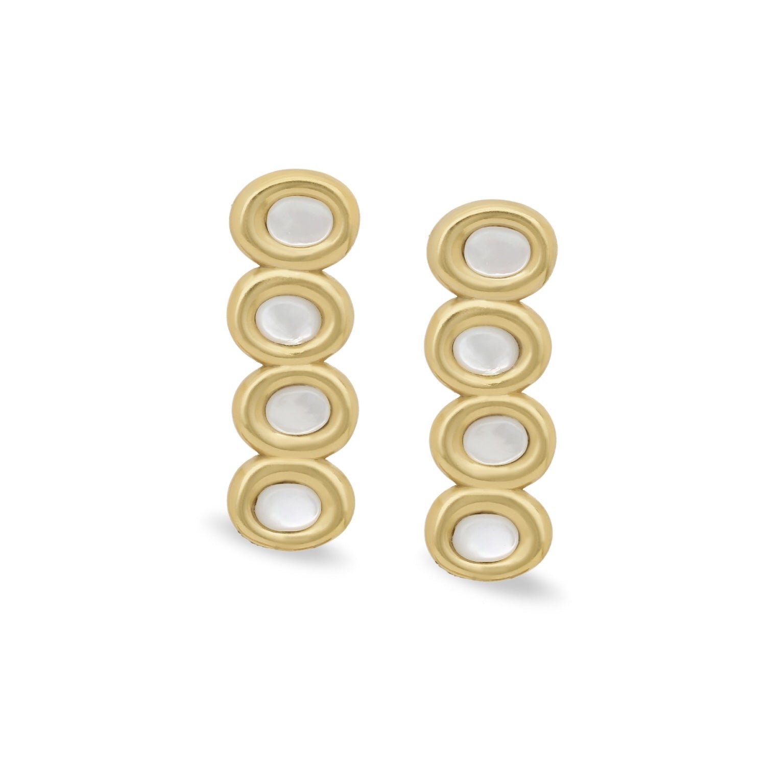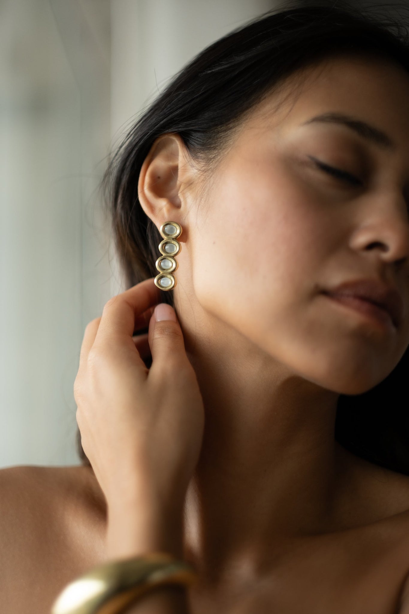 These earrings feature a vertical arrangement of rounded forms with smooth, organic contours. The repeated silhouette adds subtle volume and balance