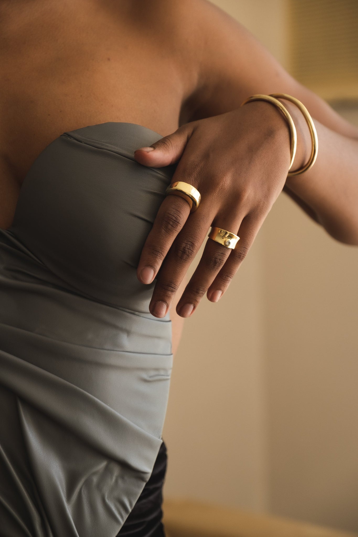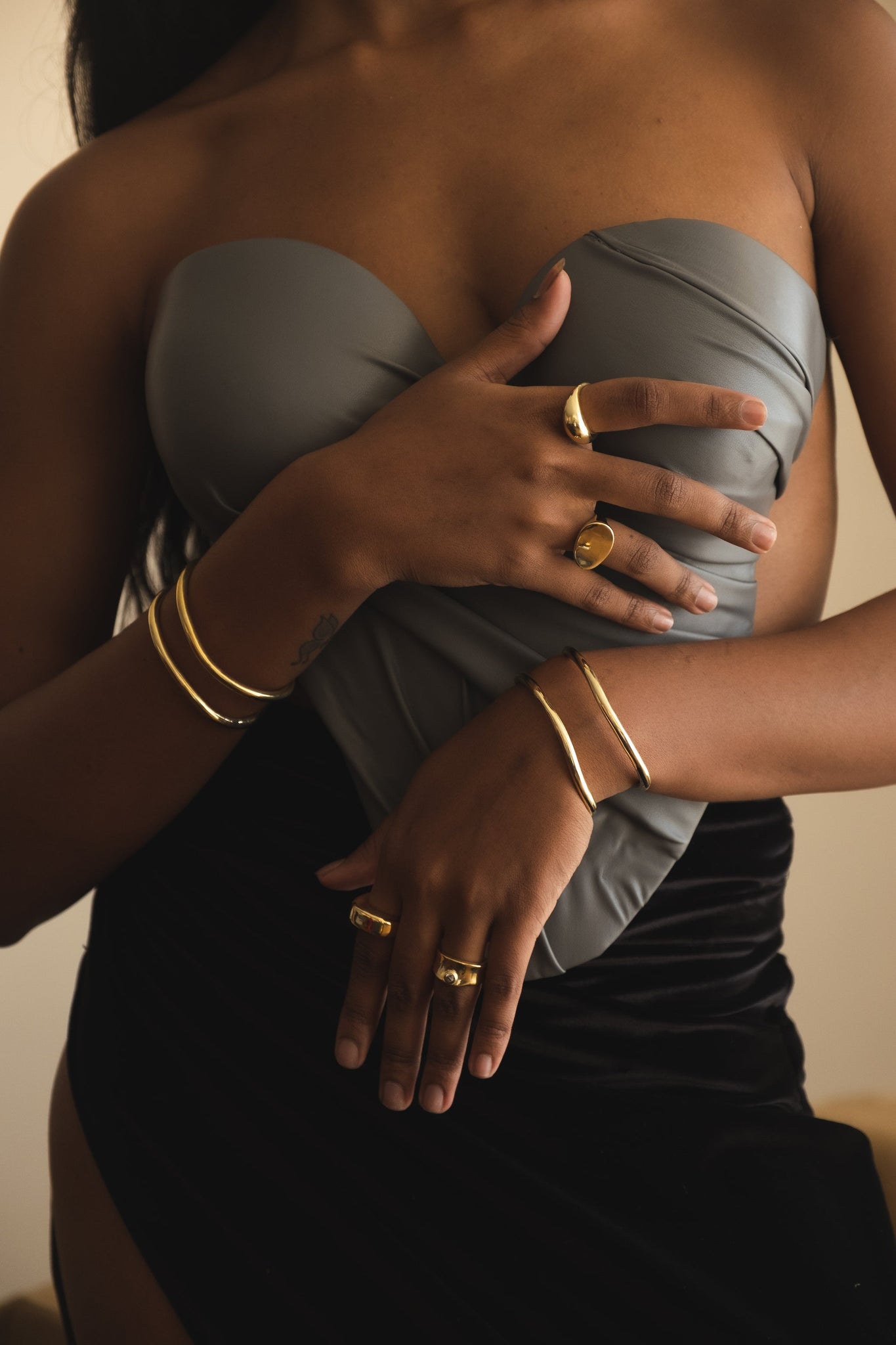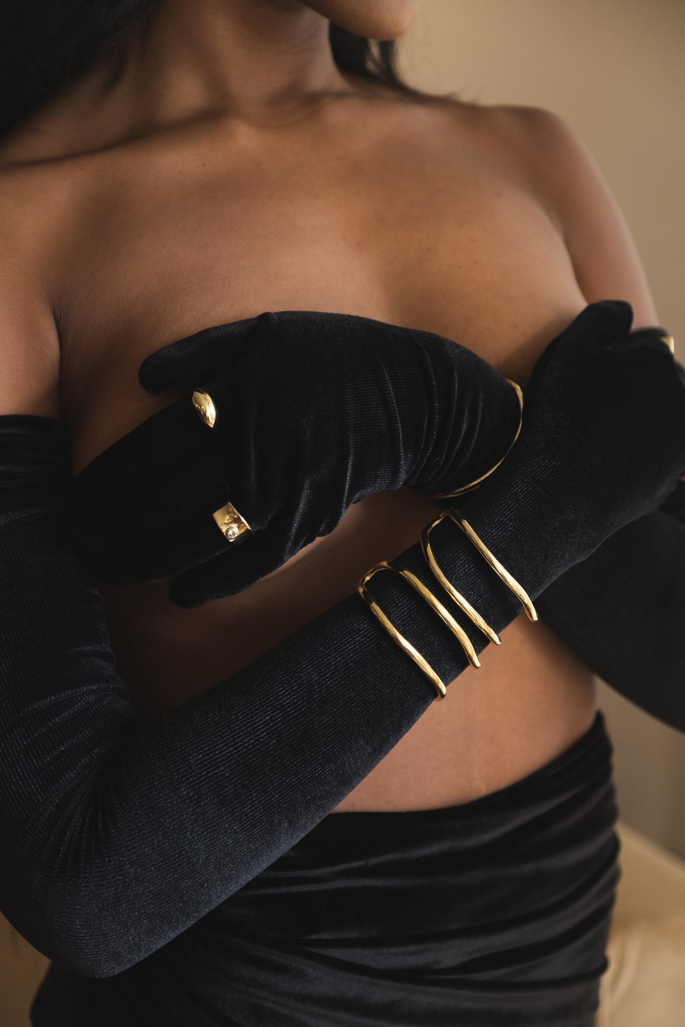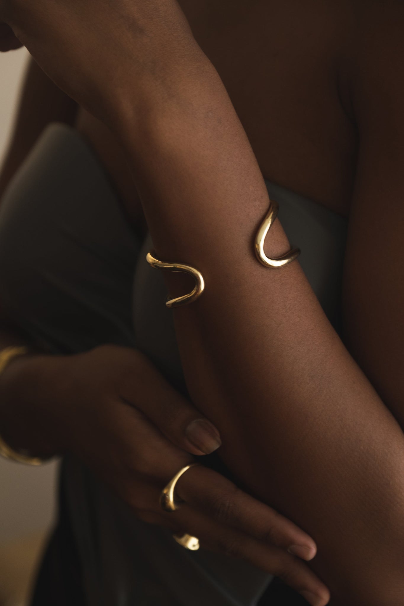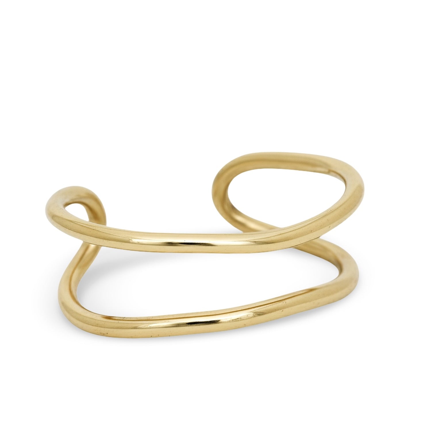 An open bangle that flows with organic movement — its sinuous lines wrap gracefully around the wrist and allow for a gentle, adjustable fit