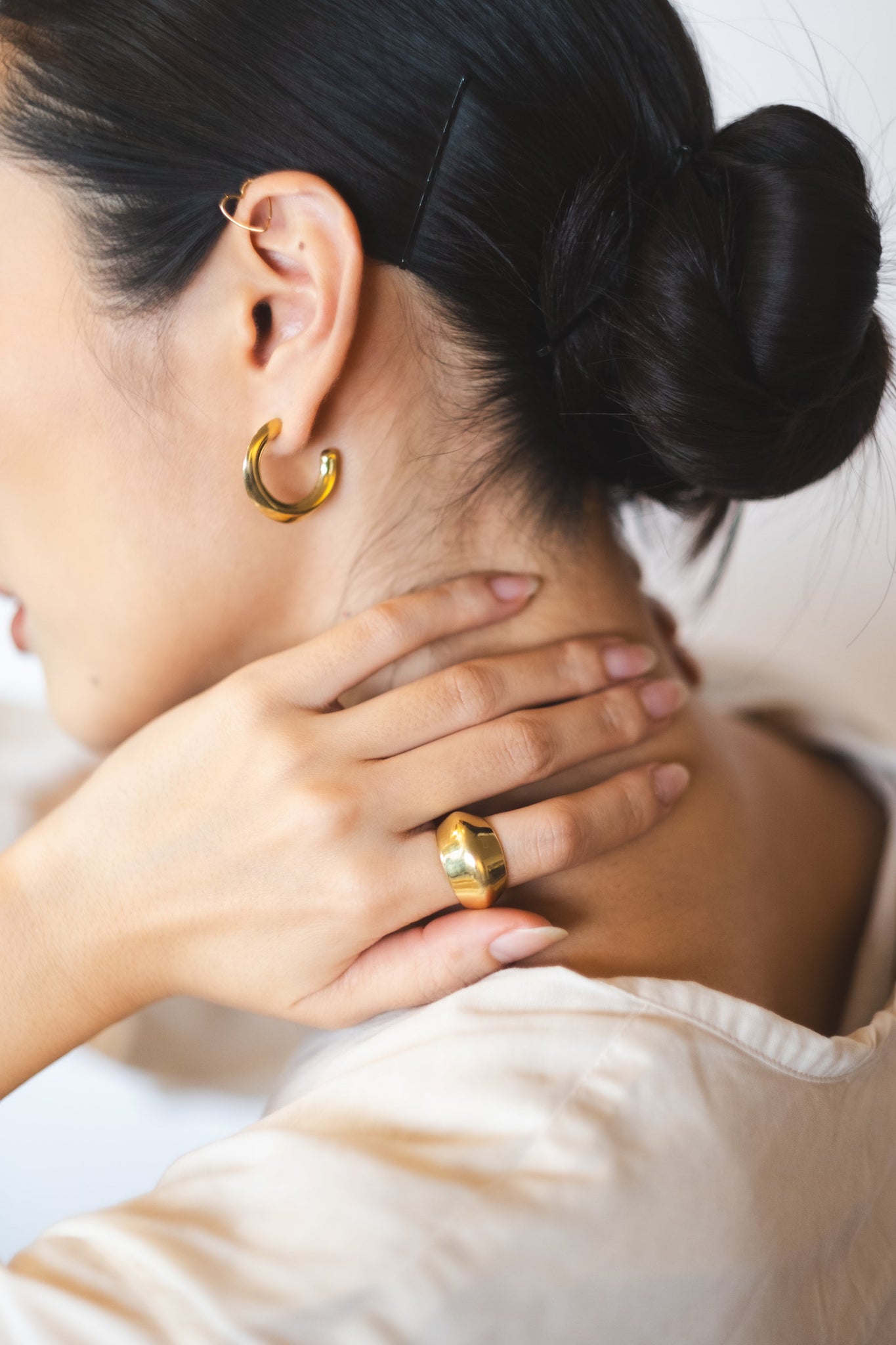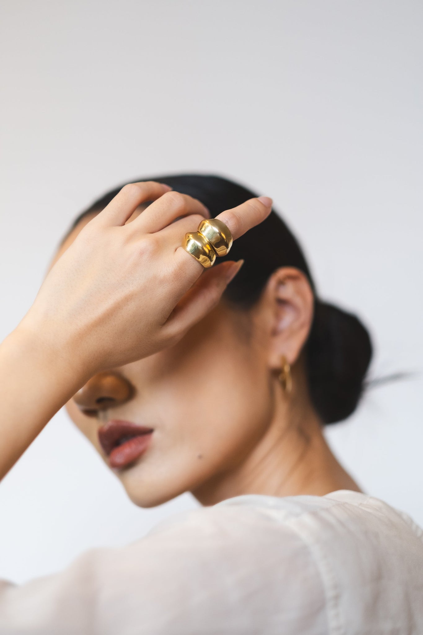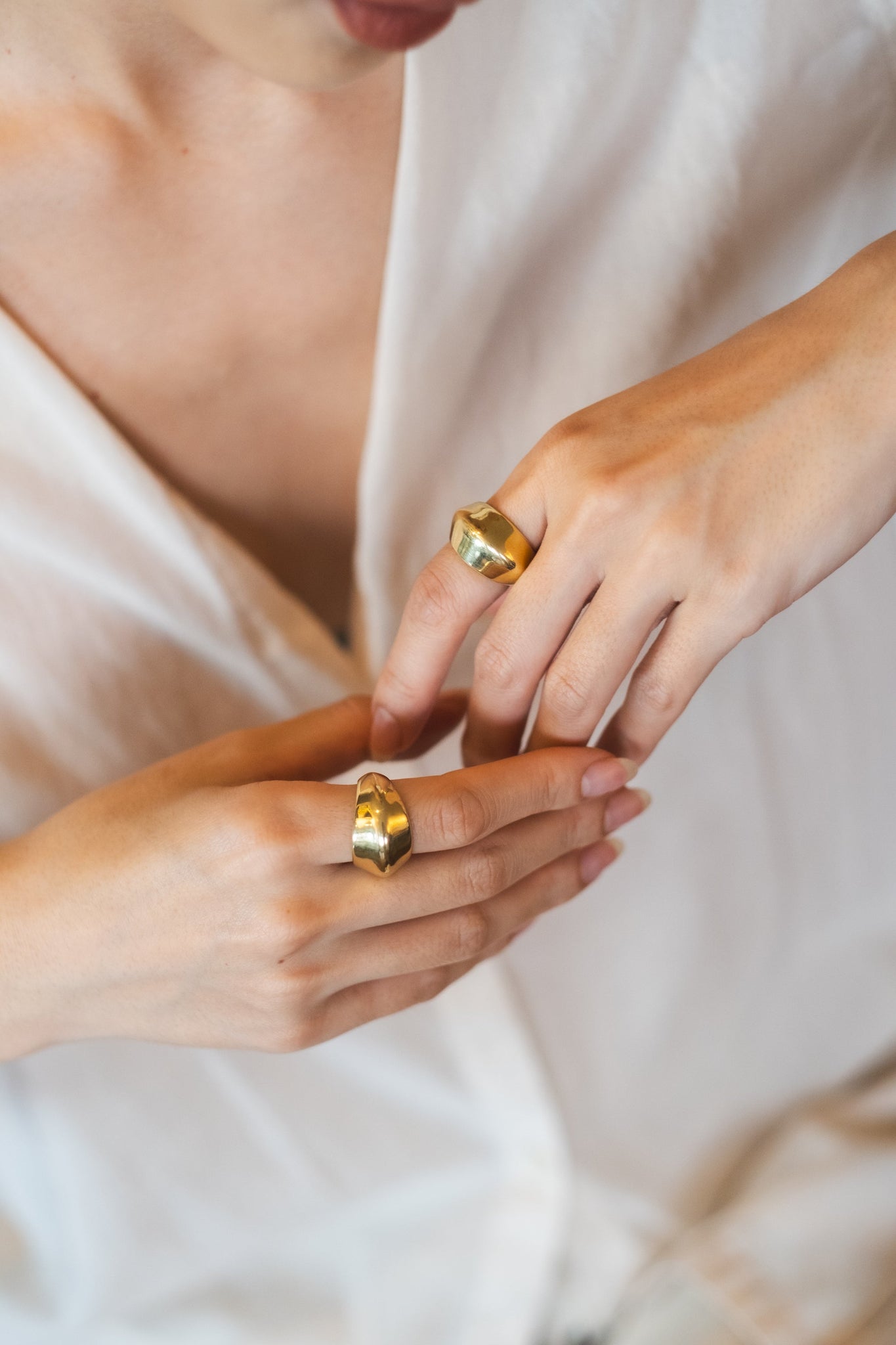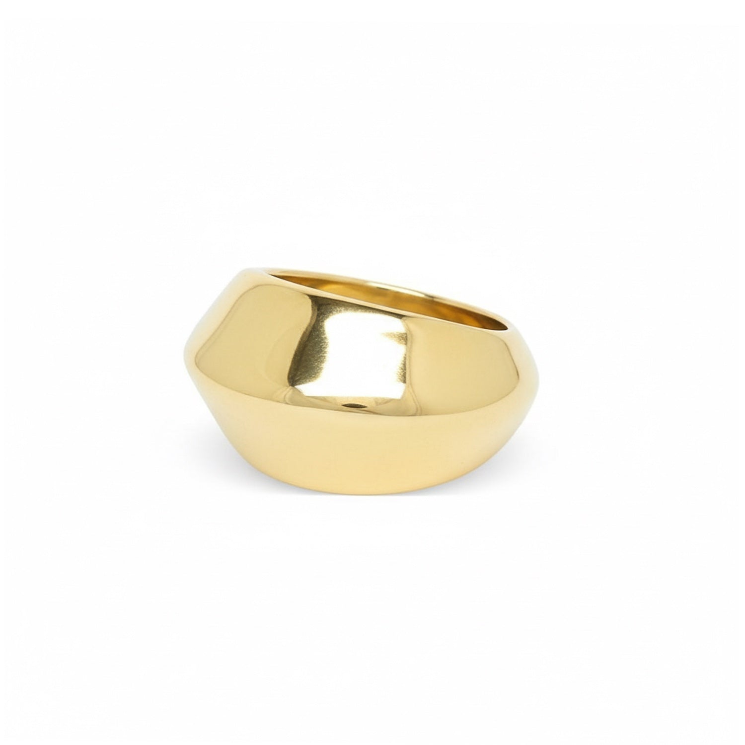 Bold ring with a faceted silhouette and soft contours. Its sculptural shape blends flat planes and subtle curves, creating a play of reflections that highlights its contemporary character