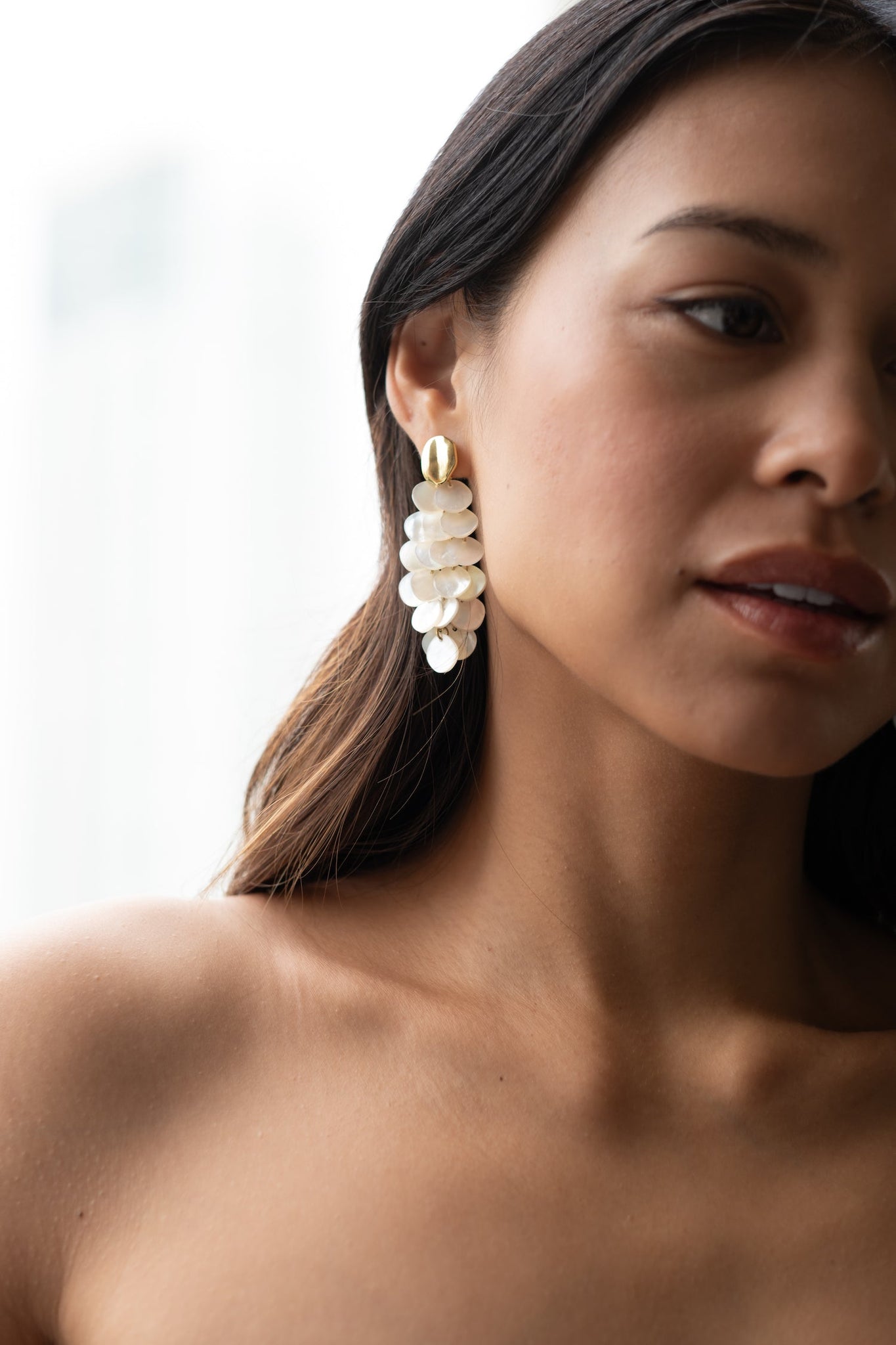 These chandelier-style earrings feature cascading layers inspired by traditional Filipino lanterns. Their structured silhouette adds a modern, elegant touch