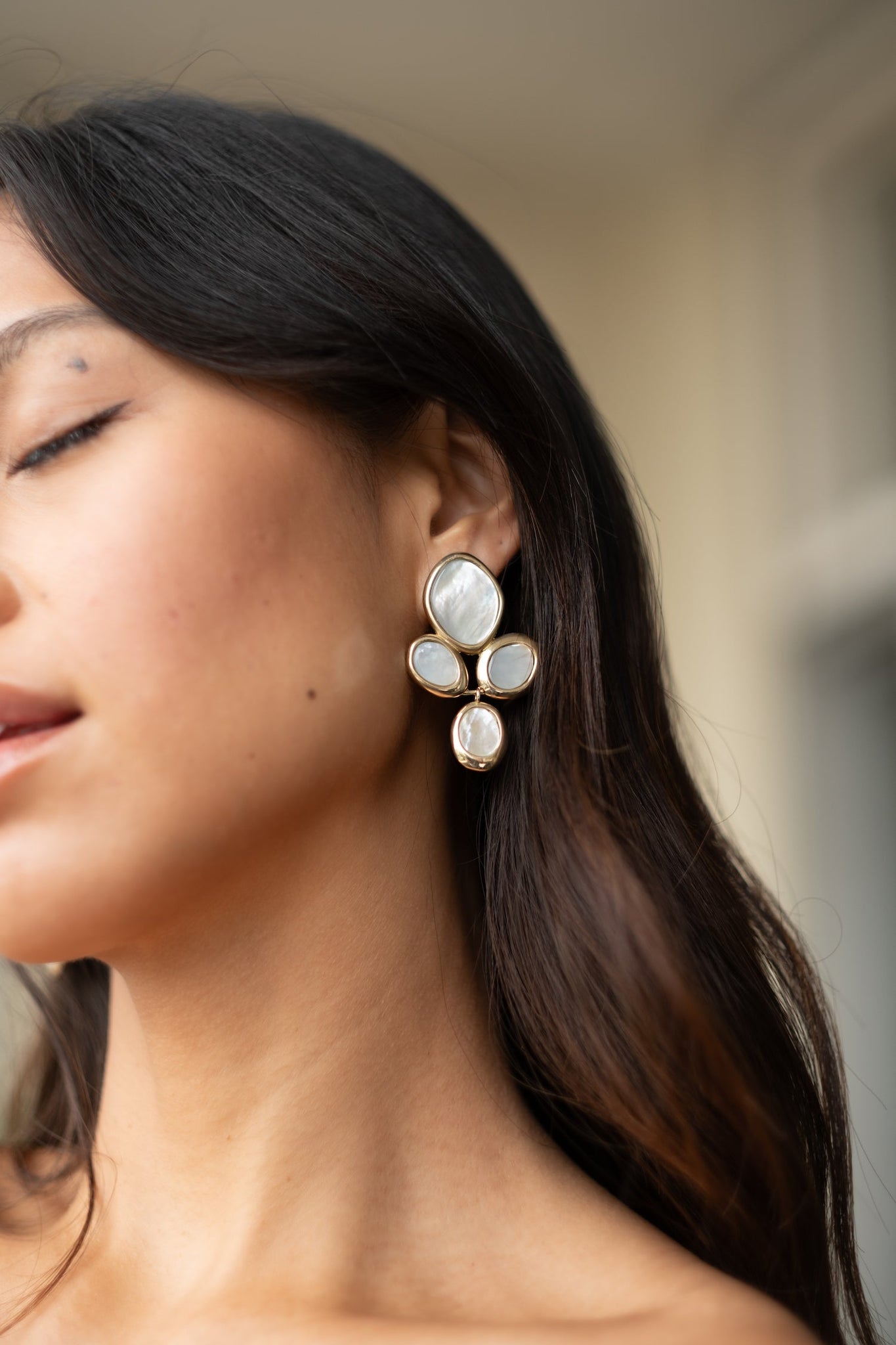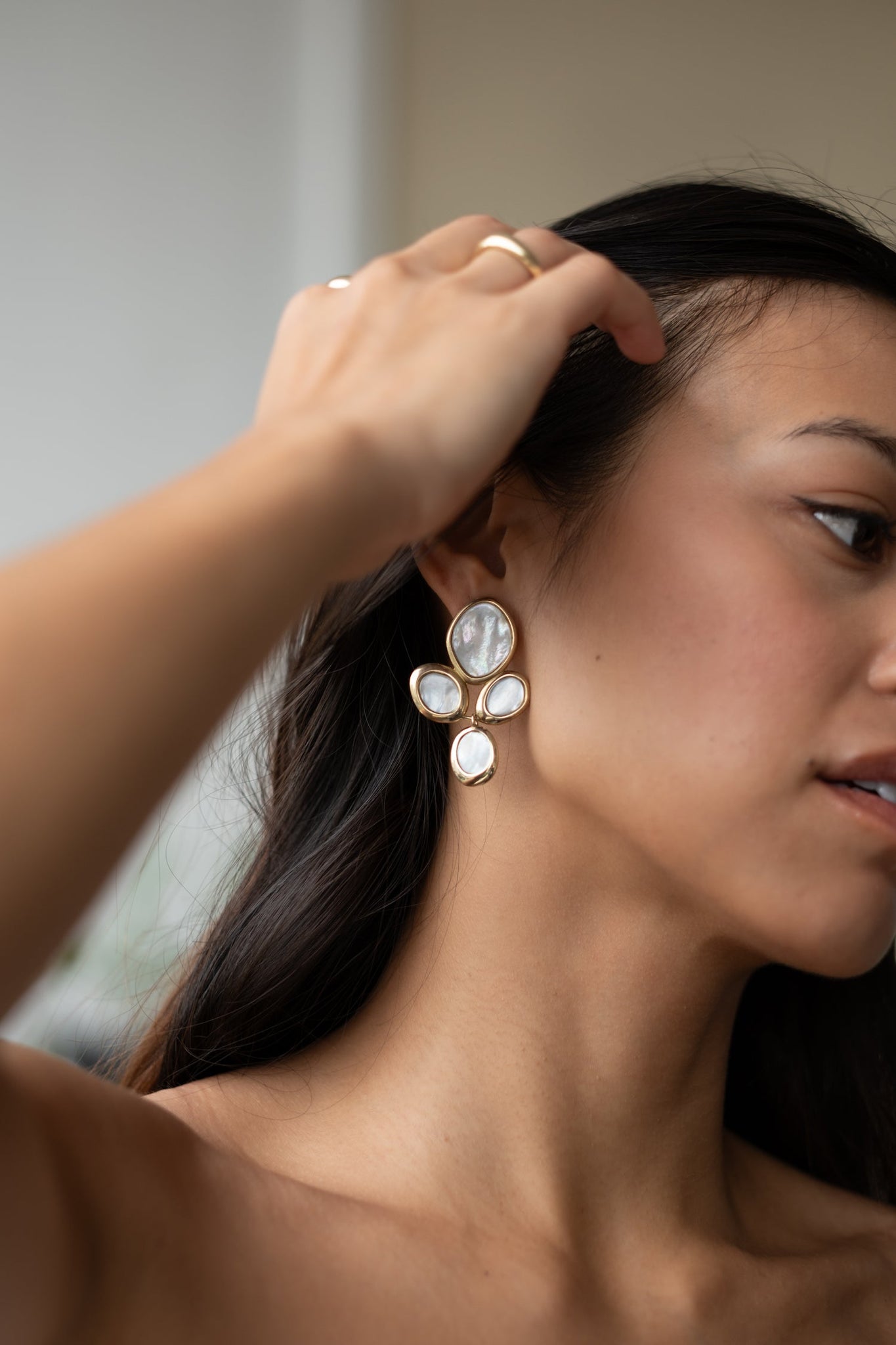 Bold and symmetrical, these petal-shaped earrings create a sculptural silhouette that frames the face with balance and softness. A refined statement piece with a strong visual impact
