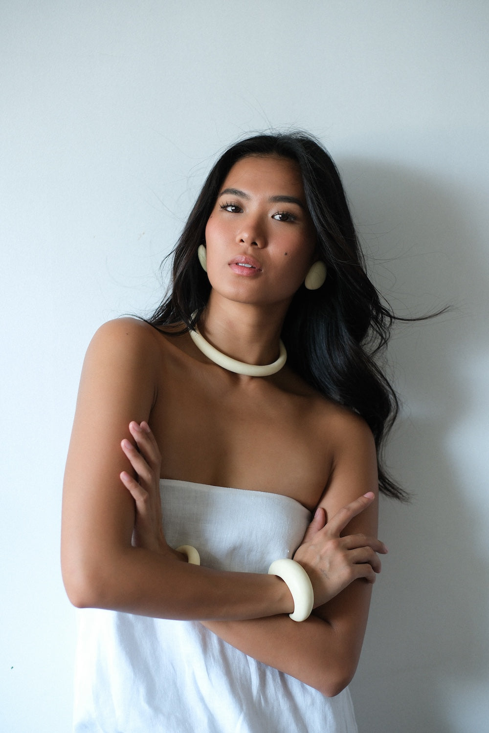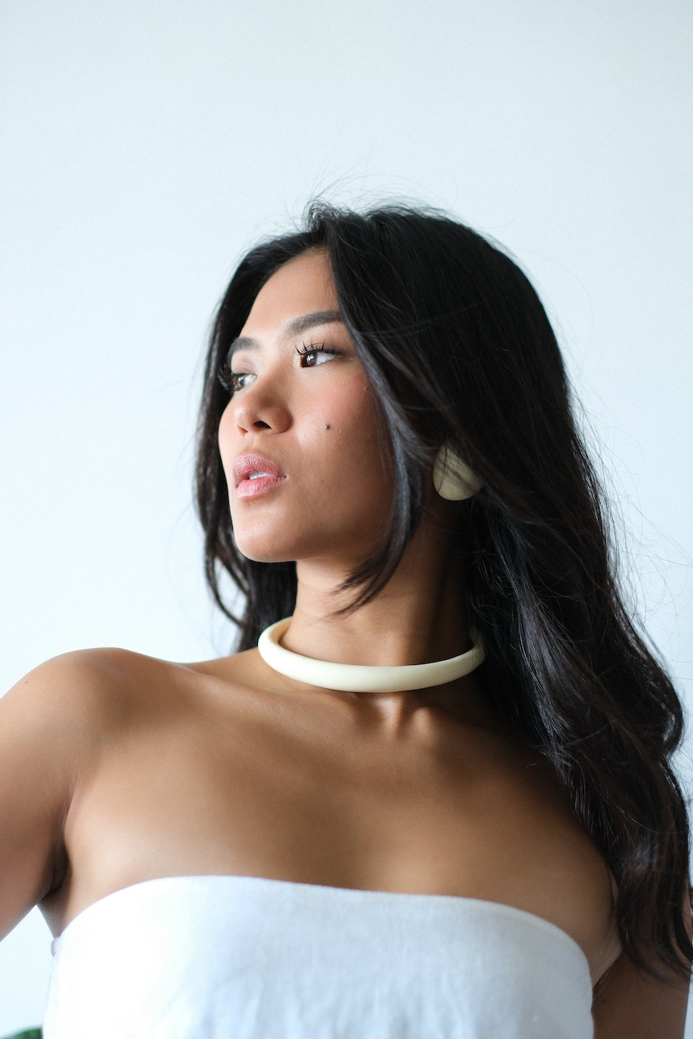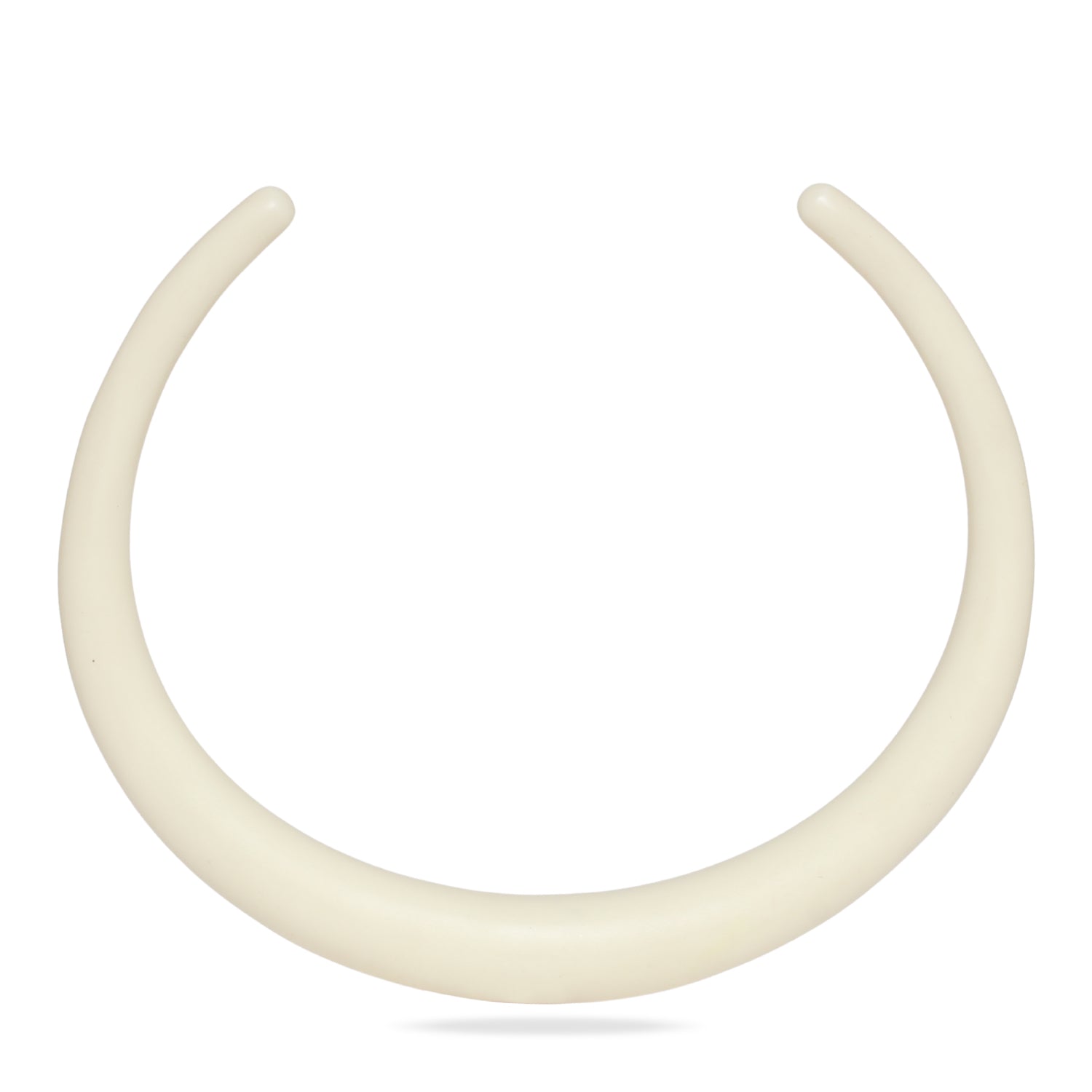 Rigid ivory-toned resin choker with a semicircular shape and clean lines. Its open design fits naturally around the neck, highlighting the soft luminosity of its matte finish