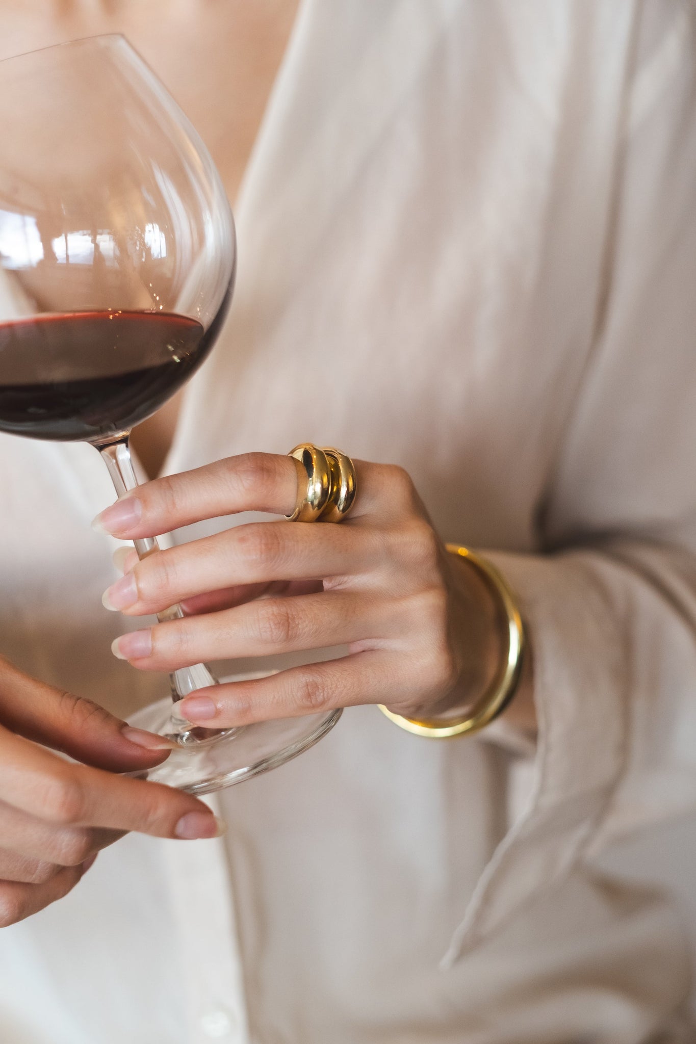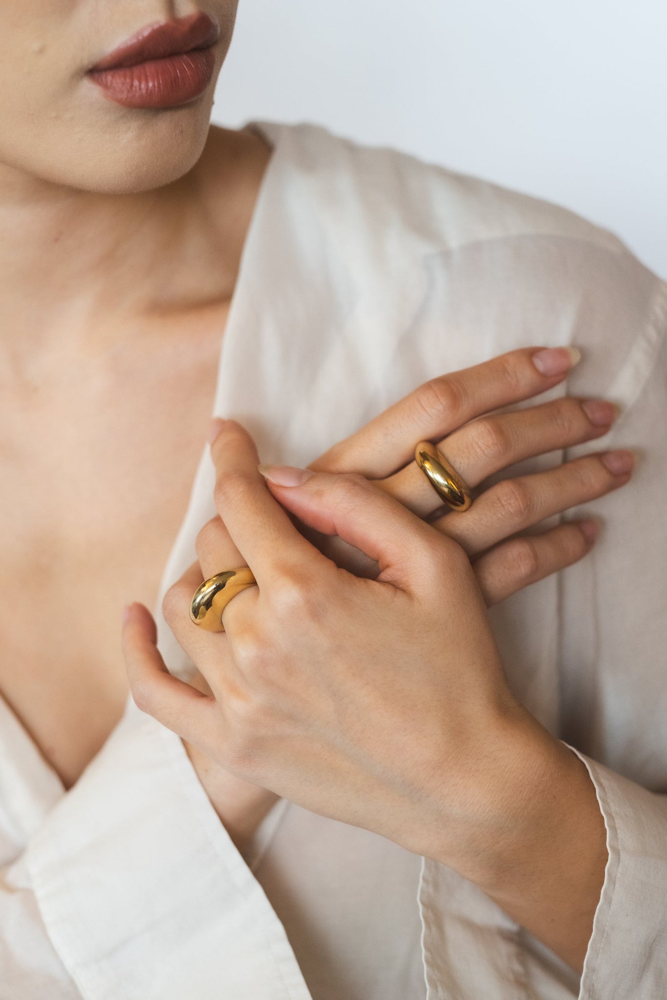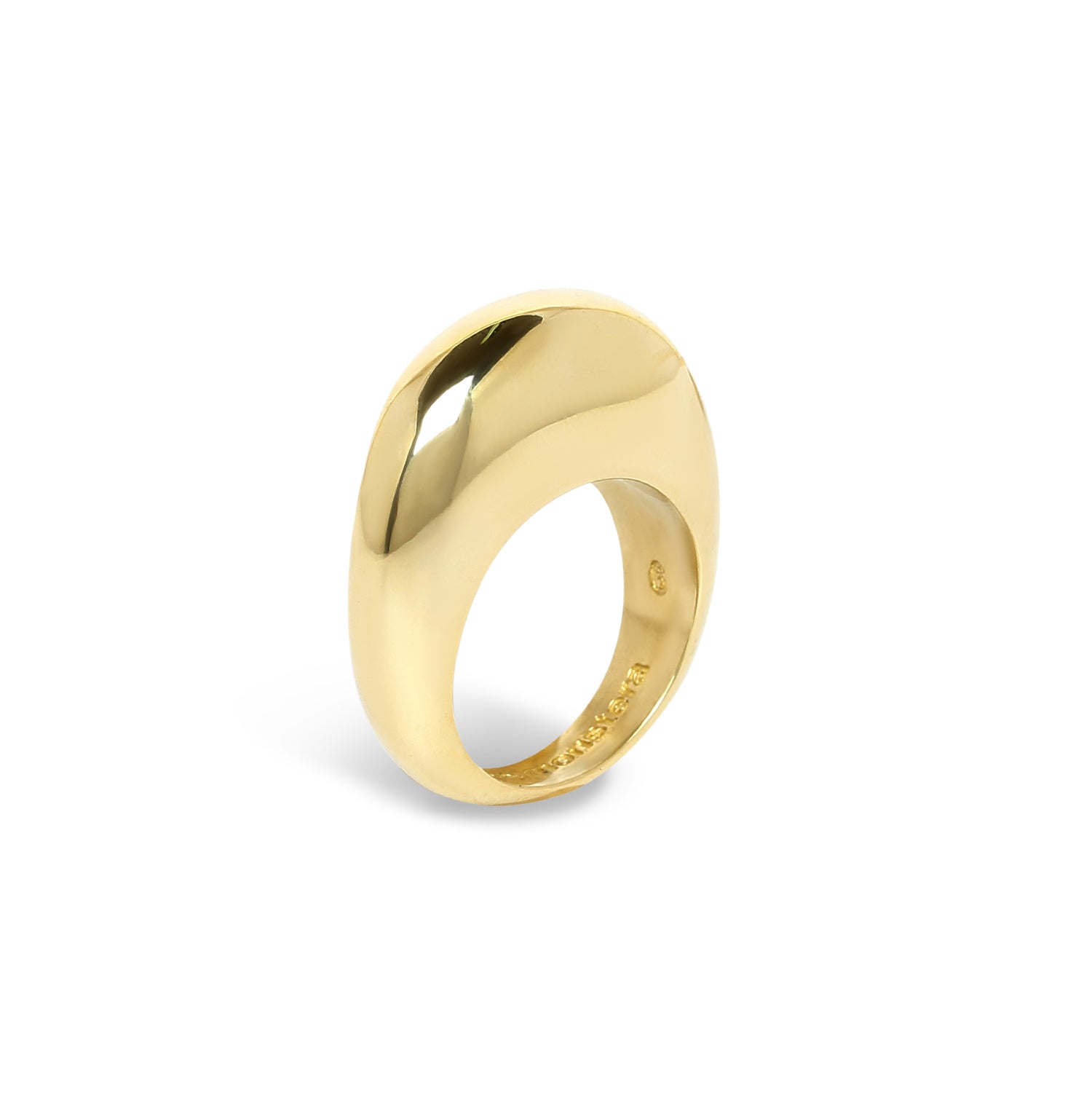 A domed ring with an elongated shape, its volume gently rises toward the center, creating a balanced, contemporary silhouette