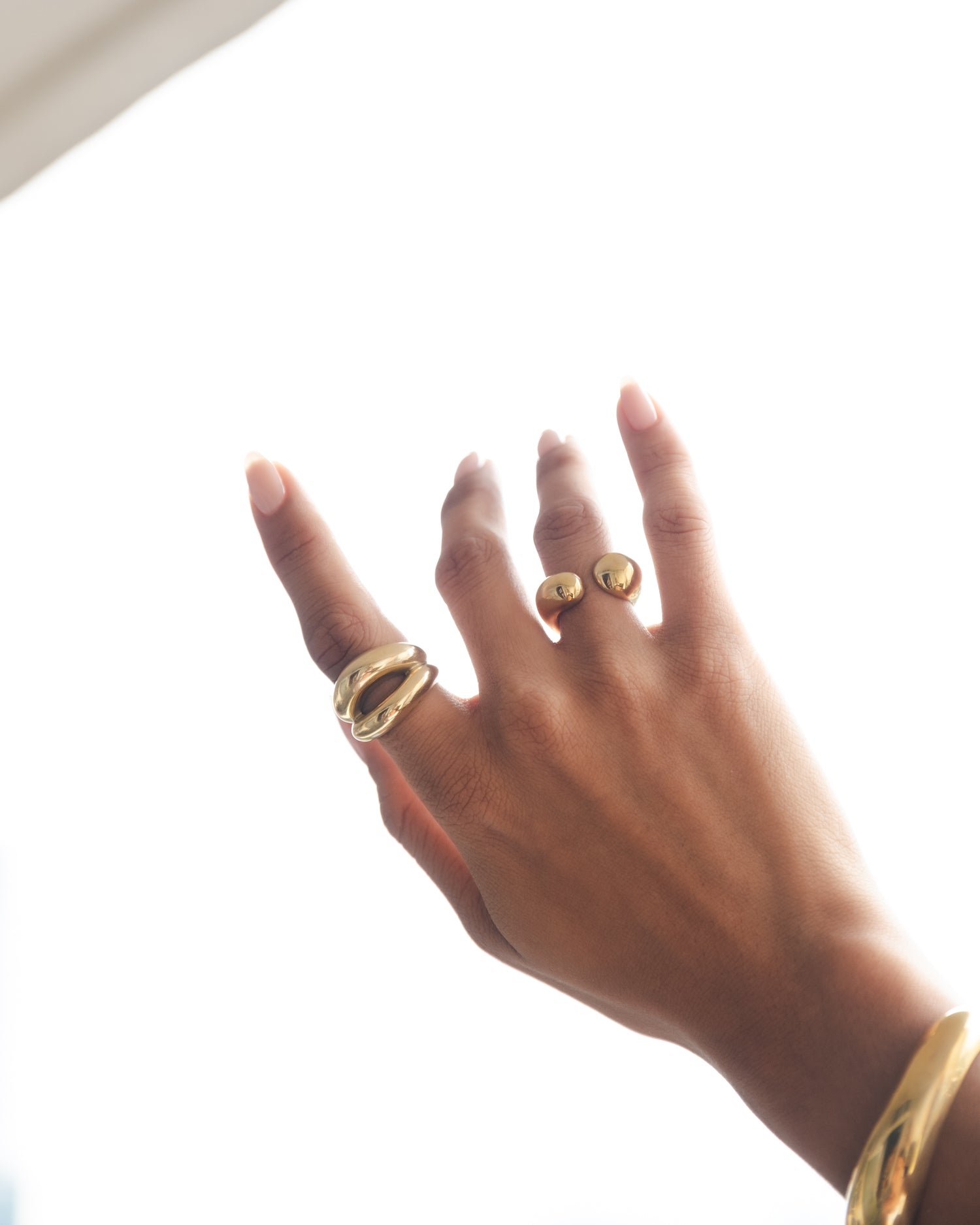 Solid open ring with rounded ends that rise gracefully, its subtle curve embodying perfect balance